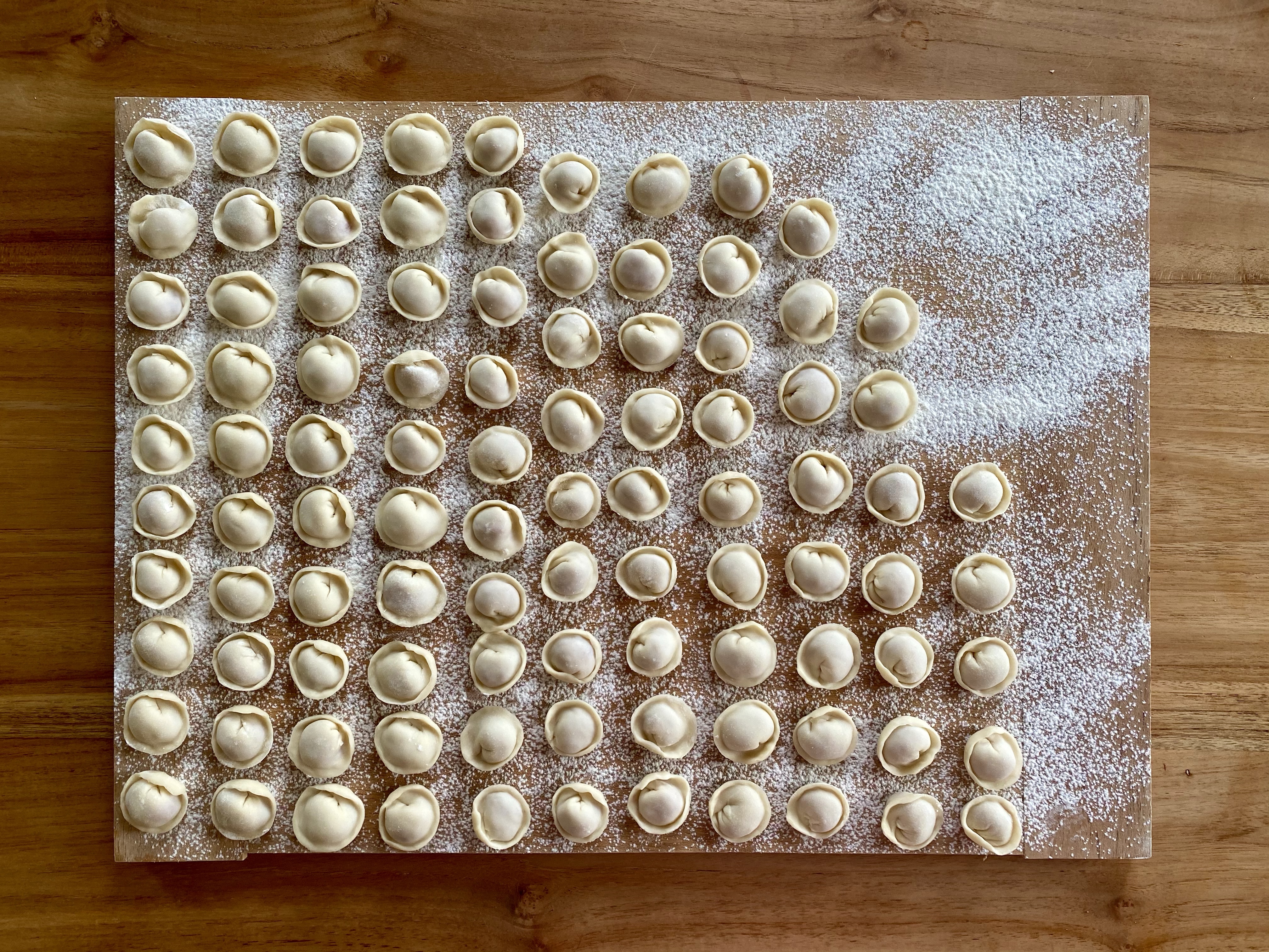 Wenig Füllung mit Hilfe eines Espressolöffels in die Mitte von jedem Kreis geben (ca. 1/3 – 1/4 des Espressolöffel). Zu Pelmeni formen (gleiche Technik wie Tortellini). Auf einem gut bemehlten Brett aufreihen, mit einem Tuch zudecken. Teigreste erstmal zurück in die Schüssel geben, mit dem restlichen 3/4 vom Teig so weiterverfahren (Teigreste erst am Schluss zusammenkneten und verarbeiten). Es kann sein, dass der verbliebene Teig während der Zubereitung an Elastizität verliert, dann etwas Mehl unterkneten, bis der Teig wieder schöne Konsistenz hat.