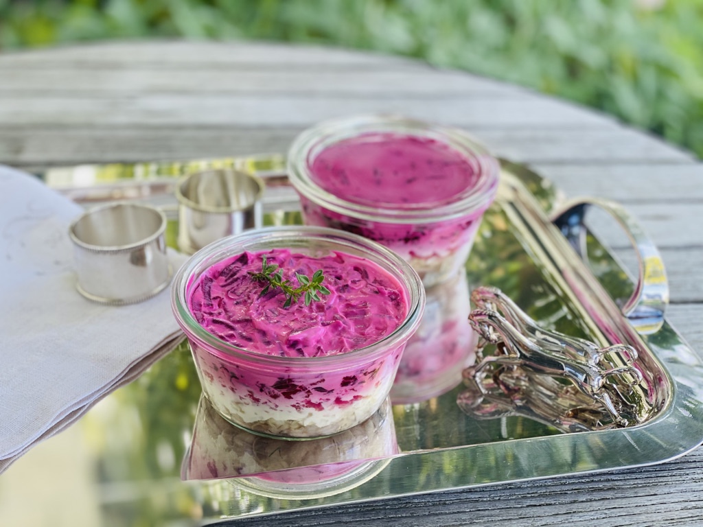 Liebe Emma, lieber Moritz! Immer wenn eure Oma uns für ein paar Wochen besuchen kommt, stelle ich im Vorfeld eine Menü-Liste zusammen mit verschiedenen Gerichten aus meiner Kindheit. Diese arbeitet unsere liebe Oma dann fleissig ab. So wie jetzt auch wieder. Ein Gericht steht meist auf der Liste – Hering im Pelzmantel (russisch: Селедка под шубой), oder russischer Schichtsalat. Dies ist mein persönliches Soulfood. Ich kenne niemanden in meiner alten Heimat Ukraine, der diesen Salat nicht mag. Genauso, wie ich in der Schweiz niemanden kenne, der ihn mag. Hering, gepaart mit einer dicken Schicht Mayonnaise, ist hierzulande nicht jedermanns Sache. Deshalb verspeisen eure Oma und ich diese Köstlichkeit und Überbleibsel der UdSSR-Zeit zu zweit – euren Papi konnten wir bisher nicht dafür begeistern. Und so geht er …