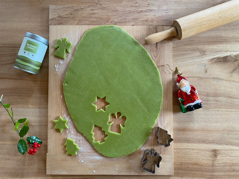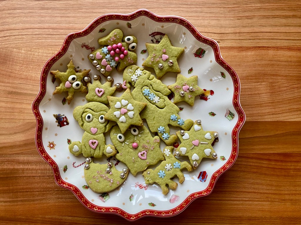 Mehl und Matchapulver vermischen. Mit den restlichen Zutaten zu einem Teig verkneten und in Folie eingepackt 2 Stunden im Kühlschrank ruhen lassen. Den Teig mit Mehl bestäuben und 5 mm dick (nicht dünner) ausrollen. Förmchen Ausstechen, auf ein mit Backpapier belegtes Blech legen, dekorieren. Backen bei 180 Grad Ober-/Unterhitze in der Ofenmitte ca. 12 Min.