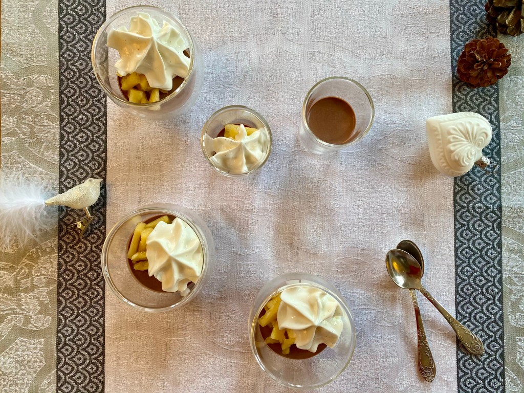 Panna Cotta: Die Gelatine in kaltem Wasser einweichen. In einem Topf die Milch mit Rahm und Zucker aufkochen. Die gut ausgedrückte Gelatine unterrühren. Die Schokolade fein hacken und im Wasserbad schmelzen. Ein Drittel der Milch-Mischung über die geschmolzene Schokolade giessen. Mit einem Teigschaber verrühren bis die Masse glatt ist, die restliche Milch auf die gleiche Weise einarbeiten. Mit dem Stabmixer kurz durchmixen. Die Creme in Gläser verteilen. Im Kühlschrank ca. 3 Stunden oder über Nacht fest werden lassen.