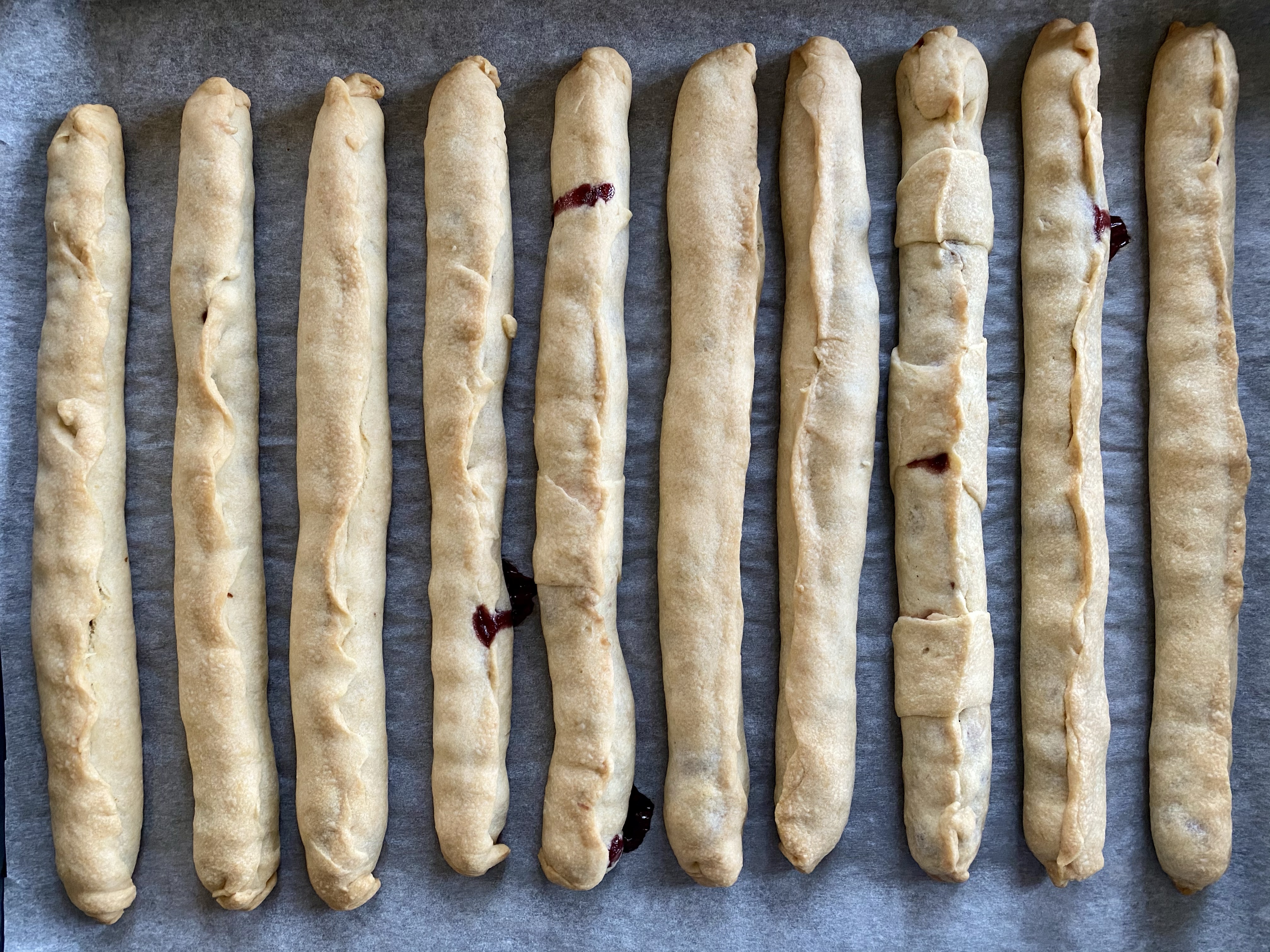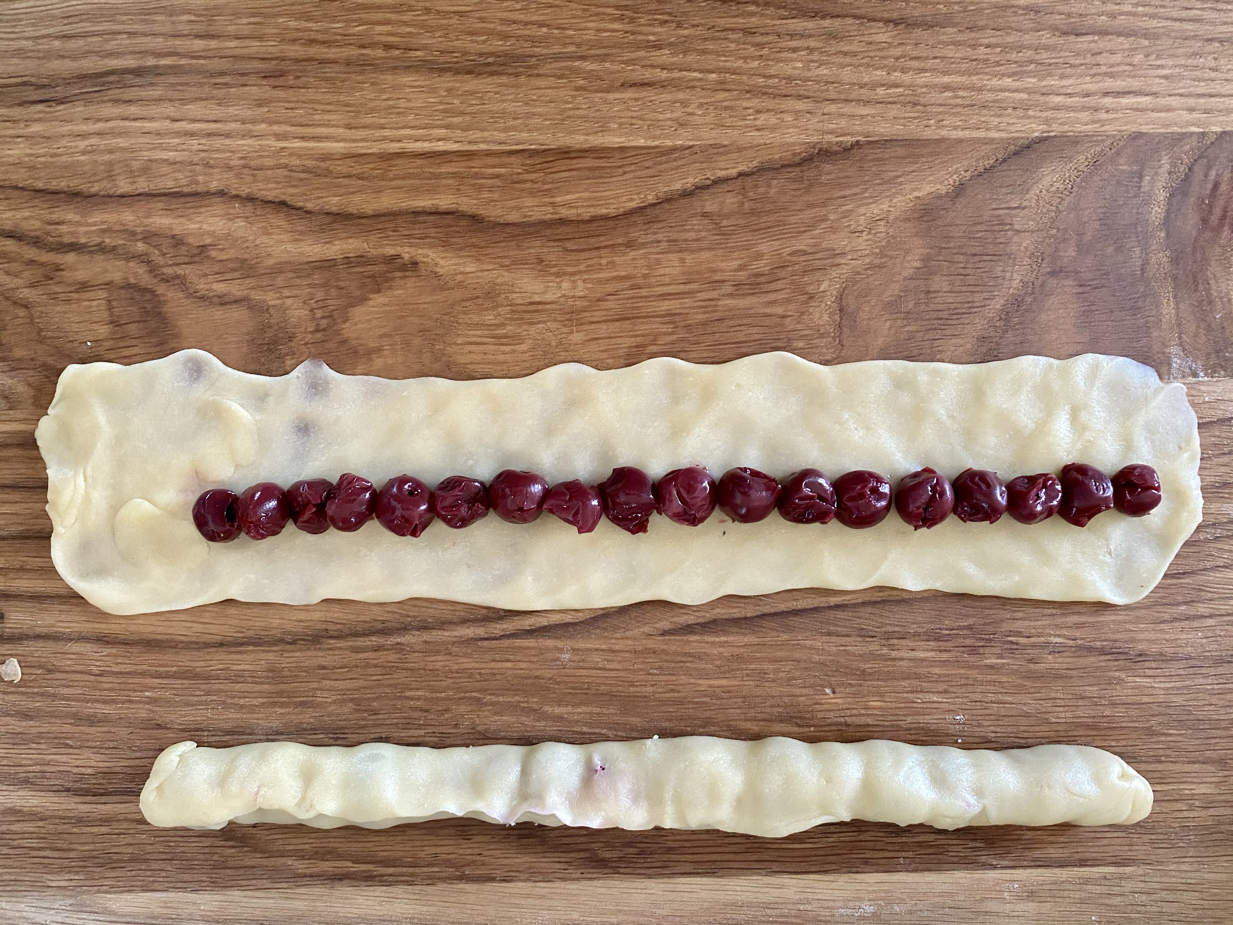 Den Teig in 10 Teile trennen (abwiegen), zu Kugeln formen. Jede Kugel zu einem Röllchen mit den Händen ausrollen (die Länge sollte ca. der schmaleren Seite vom Backblech entsprechen, etwas kleiner). Wichtig ist, dass alle Rollen gleich lang sind. Dann mit den Fingern jedes Röllchen flach klopfen, so dass darin eine Reihe Kirschen Platz hat. Auf dem Teig eine Reihe Kirschen dicht an dicht platzieren, die Seiten fest zusammendrücken, wie bei der Herstellung von Pasta mit Füllung. Auf ein mit Backpapier belegtes Blech legen. So weiterverfahren, bis alle 10 Röllchen bereit sind.
