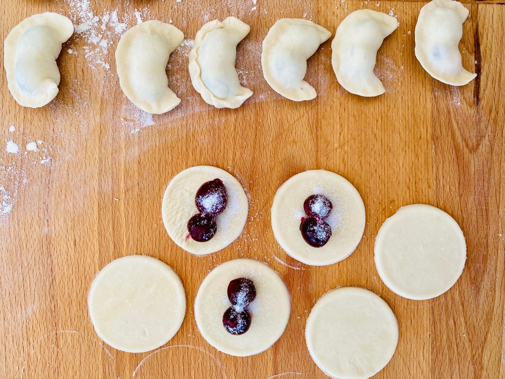 Am besten auf einem Holzbrett arbeiten. Das Brett mit Mehl bestreuen, den Teig ca. 2 mm hoch auswallen (wie für Ravioli). Ich fange normalerweise mit 1/2 vom Teig an, und lasse die andere Hälfte in Frischhaltefolie im Kühlschrank. Mit dem runden Ausstecher von ca. 5.5 cm Durchmesser Kreise ausstechen (falls die Kirschen gross sind, dann einen grösseren Ausstecher nehmen, damit die Kirschen genug Platz haben, und die varenyky sich gut zusammenklappen lassen). So ca. 7 Kreise auf einmal ausstechen (nicht zu viele auf einmal, sonst wird der Teig trocken, und lässt sich nicht mehr einfach verarbeiten). Auf jeden Kreis 2 Kirschen hinlegen, die Kirschen mit wenig Zucker bestreuen, jeden Kreis zu einem Halbmond fest zusammenklappen. Vorsichtig arbeiten, um die Kirschen nicht zu zerquetschen.