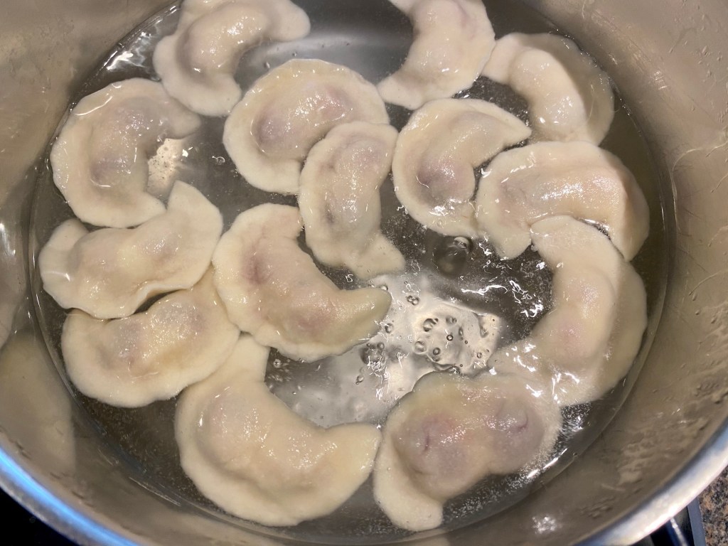 Wasser im Topf salzen. Varenyky einen nach dem anderen sehr vorsichtig in siedendes Wasser tun (das Wasser darf auf keinen Fall kochen). Sobald sie an die Wasseroberfläche aufgeschwommen sind, noch 4 Min. siedend köcheln. Ein einem separaten Topf etwas Butter schmelzen, und vom Herd nehmen. Varenyky vorsichtig mit einer Schaumkelle herausnehmen, in den Topf mit der Butter reintun. Sehr vorsichtig umrühren (nicht schwenken) und servieren. Mit wenig Zucker bestreuen.