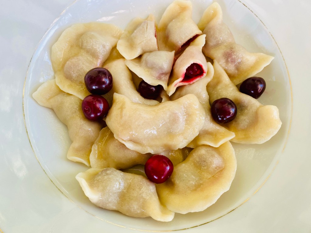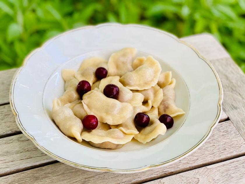Ihr kennt schon den Film „Ratatouille“, und wisst, dass dies mein Lieblingsfilm ist. Ich mag die Philosophie „Jeder kann kochen“, und dass Träume, die einem unerreichbar scheinen, sehr wohl in Erfüllung gehen, wenn man alles dafür tut. Es gibt eine Szene im Film, in der der Restaurant-Kritiker den ersten Biss von Ratatouille probiert, und sich Bilder aus seiner Kindheit in seinem Kopf abspielen. Genau so geht es mir mit diesem Gericht 🙂 Meine beiden Omas hatten Kirschbäume in ihrem Garten. Als ich meine langen Sommeferien bei ihnen verbracht habe, gab es oft diese Sauerkirschen-Varenyky. Für mich sind sie DER Geschmack vom Sommer – und von Kindheit.