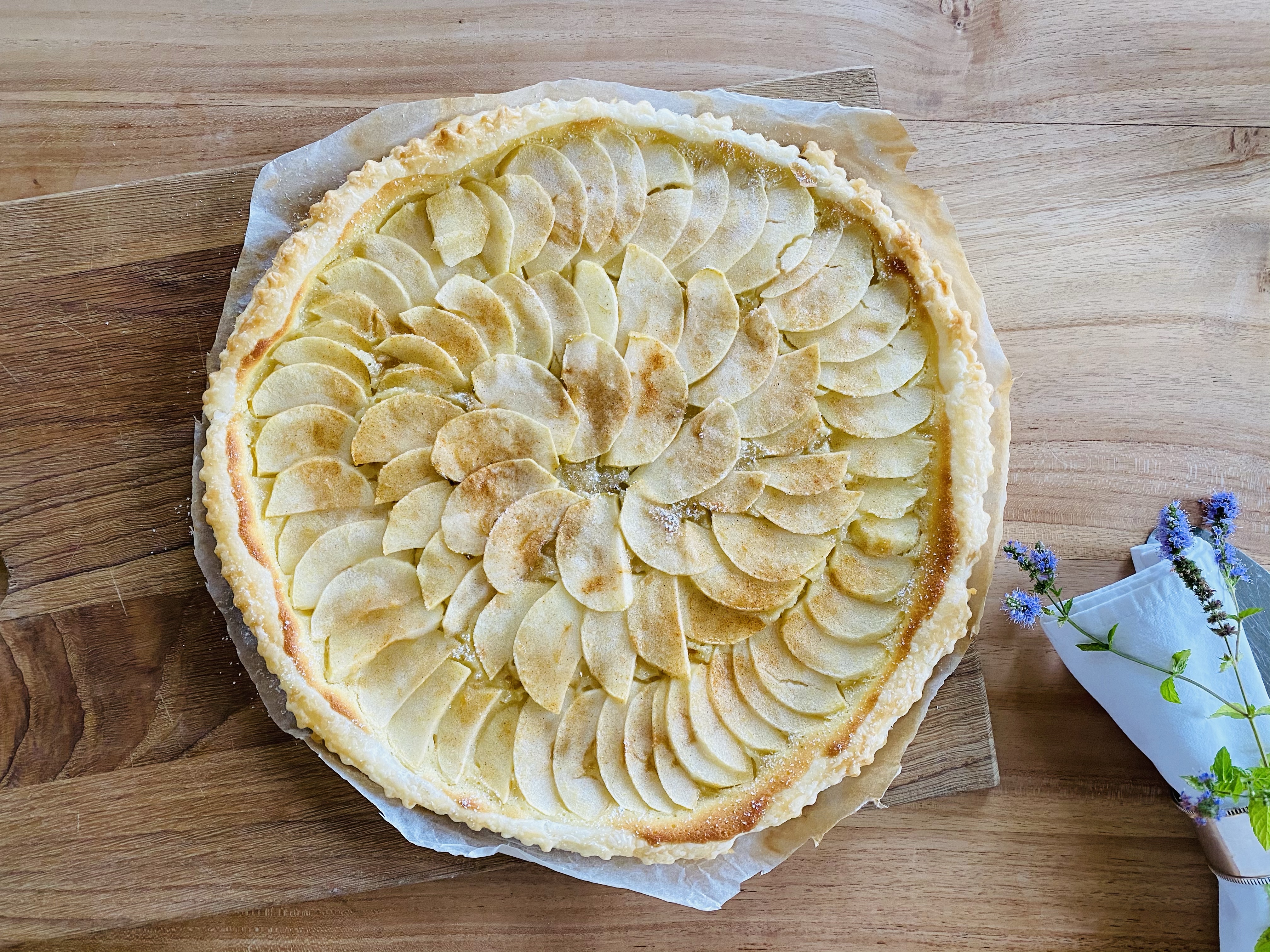 Den Teig aus dem Kühlschrank nehmen, ausrollen und mit dem gewellten Teigrand den Rand ringsum zuschneiden, dies ergibt ein dekoratives Muster. Den Blätterteigboden anschliessend mit dem Backpapier auf einem Backblech platzieren, mit dem Franchipan bestreichen, dabei ca. 2 cm ringsum Rand lassen, damit der Teig auf der Seite schön aufgehen kann. Die Äpfel schälen, halbieren, sehr dünn schneiden und auf der Franchipan überlappend verteilen. Die Äpfel mit Zimtzucker bestreuen.