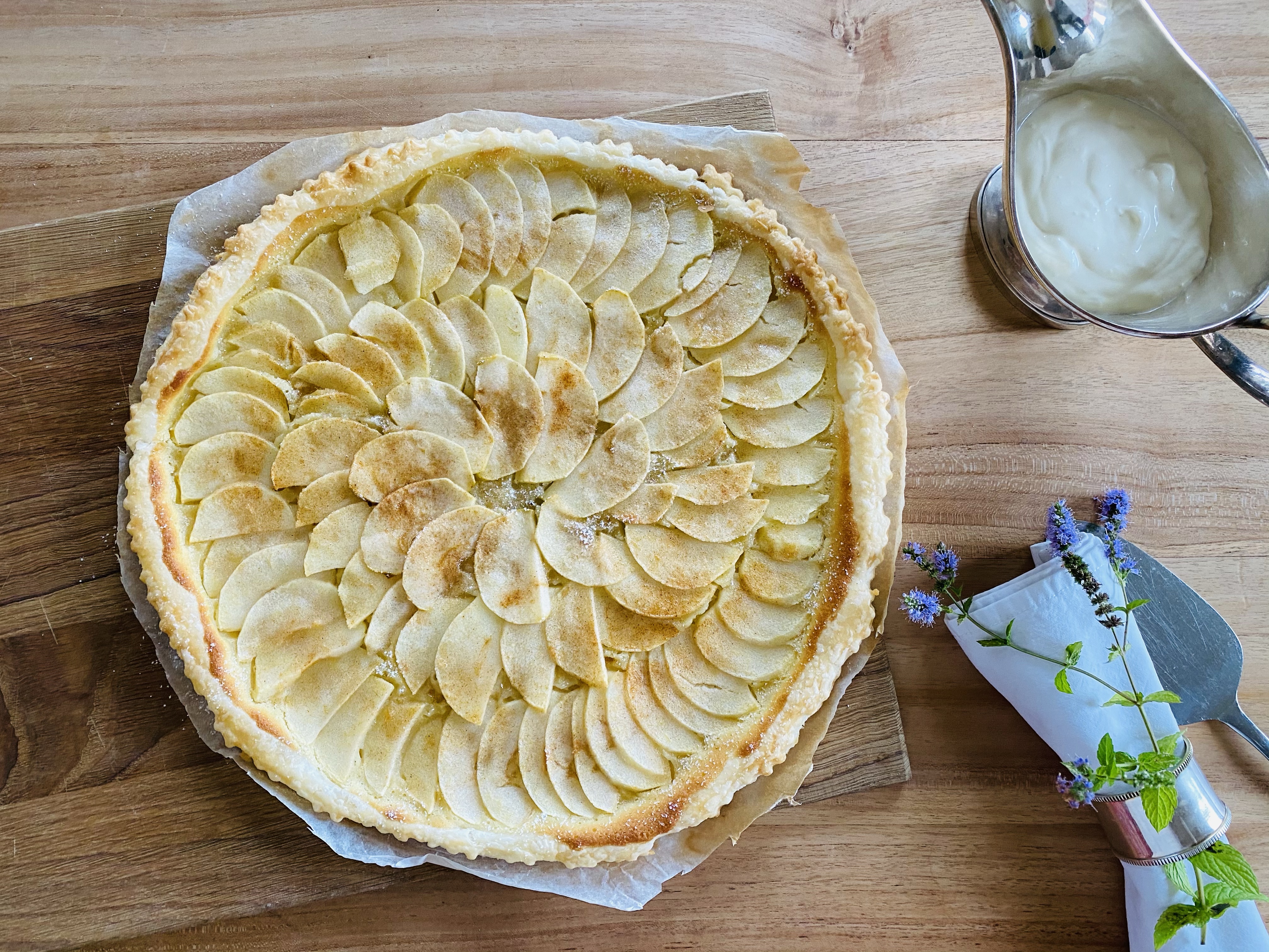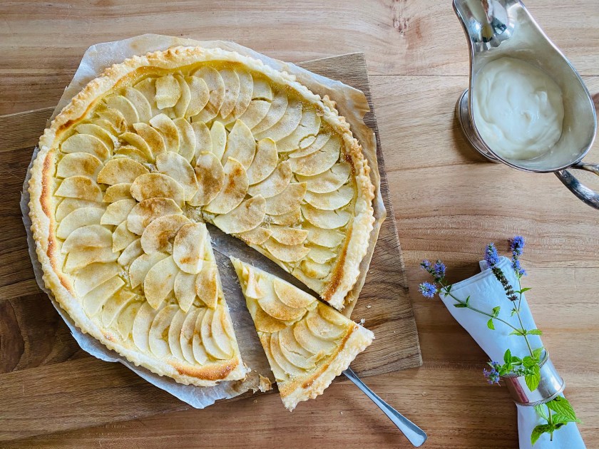 Liebe Emma, lieber Moritz. Ich kann mich noch sehr gut an den Abend erinnern, als Opa Heinz uns besucht hat – da wart ihr noch nicht auf der Welt. Er hat von Robert Speth und seinem Restaurant „Chesery“ in Gstaad geschwärmt. Und vom besten Apfelkuchen, den er je gegessen hat. Einige Male waren wir seither bei Robert Speth essen, unsere hohen Erwartungen wurden nicht enttäuscht. Sogar nach einem üppigen Mehrgänger-Menü mussten wir einfach immer die Apfeltarte bestellen, so unübertroffen war der Geschmack. Und trotz anderer Verführungen auf der Dessertkarte, wurde es doch jedesmal der Apfelkuchen. Leider gibt es die „Chesery“ nicht mehr, jahrzehntelang Platzhirsch in der Gstaader Gastroszene. Natürlich musste ich die Tarte nachbacken. Nach einigen Testversuchen, bin ich dem Original ziemlich nahe gekommen. Die Tarte gehört nun definitiv zu einem meiner Signature-Desserts.