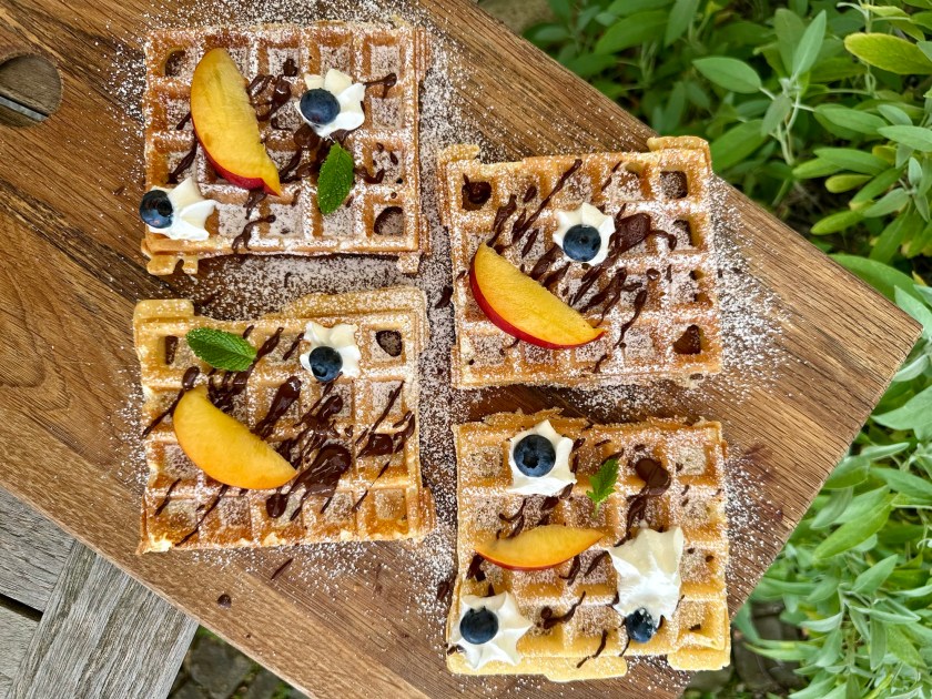 An solchen warmen Sommertagen lieben wir unsere Familienfrühstücke im Garten. Diese Waffeln machen wir sehr oft, es ist das perfekte Sonntagsfrühstück – im Sommer servieren wir sie mit allen möglichen frischen Früchten und Beeren. Und für euch – natürlich – mit der obligatorischer Schokoladensauce. Und hier geht es weiter mit dem Rezept.