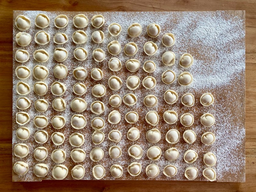 Liebe Emma, lieber Moritz. Pelmeni kennt ihr von klein auf. Oma Lesja ist quasi unsere Pelmeni-Produktionsfabrik, und kann am Stück 200+ Pelmeni aus dem Ärmel schütteln. Bevor sie abreist, wird das Gefrierfach leergeräumt, um Platz für einen grosszügigen Pelmeni-Vorrat zu machen. Dies ist eins der wenigen Gerichte, welches sich einzufrieren lohnt. Denn ihr verlangt regelmässig Pelmeni, und meine Pelmeni-Fertigkeit hält sich in Grenzen. Und dann kam Corona … Die Oma kann immer noch nicht einreisen, was uns unglaublich traurig macht. Die einzige positive Seite der Corona ist, dass ich zwangsläufig lernen musste, Pelmeni herzustellen. Diese gelingen mir zwar erstaunlich gut – wahrscheinlich das Ergebnis unzähliger Sonntage, an denen ich meiner Mutter oder den Grosseltern beim Pelmeni machen geholfen, oder einfach nur zugeschaut habe. Aber nach 2 Stunden Pelmeni-Produktion – so lange muss ich für, sage und schreibe, 97 Pelmeni einplanen (habe sie auf dem Bild nachgezählt), bin ich fix und fertig. Ich habe schon probiert, dies als eine Art Meditation zu sehen, ist mir aber bisher nicht gelungen. Das Ergebnis ist die Mühe jedoch allemal …